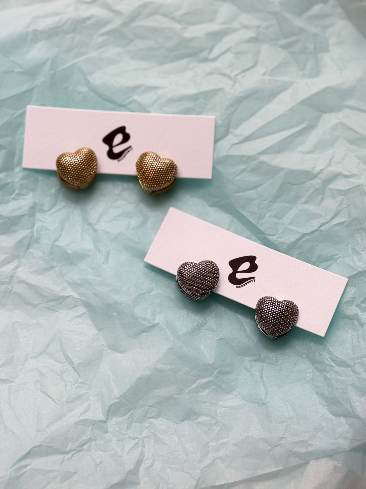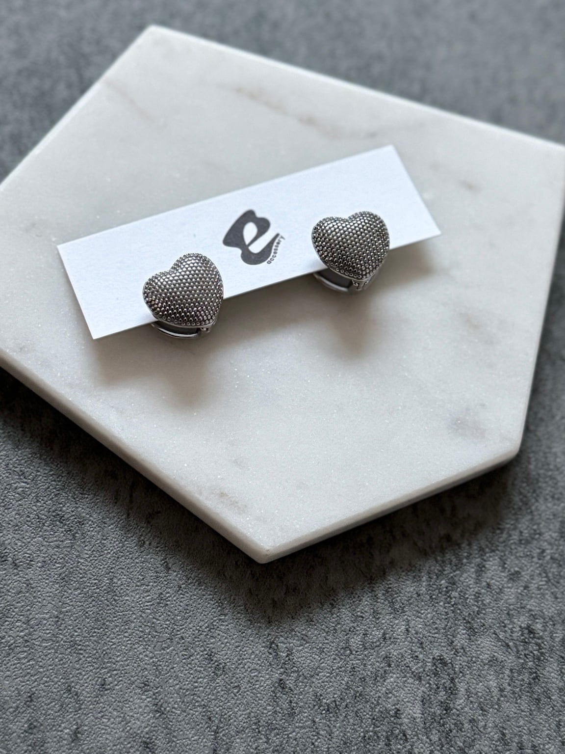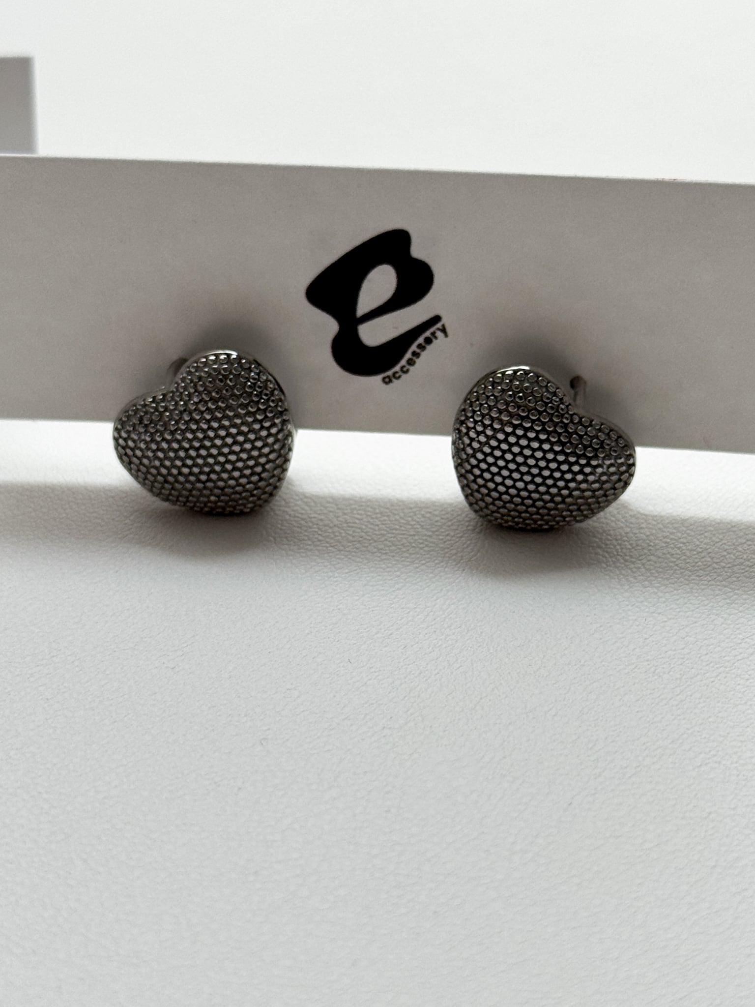 立体感のあるハートフォルムに細かいドットを施した無機質な質感のピアスになります