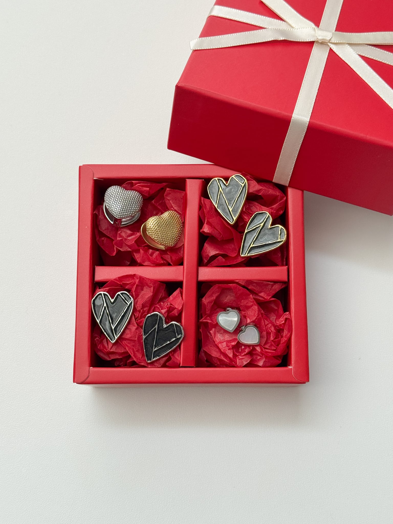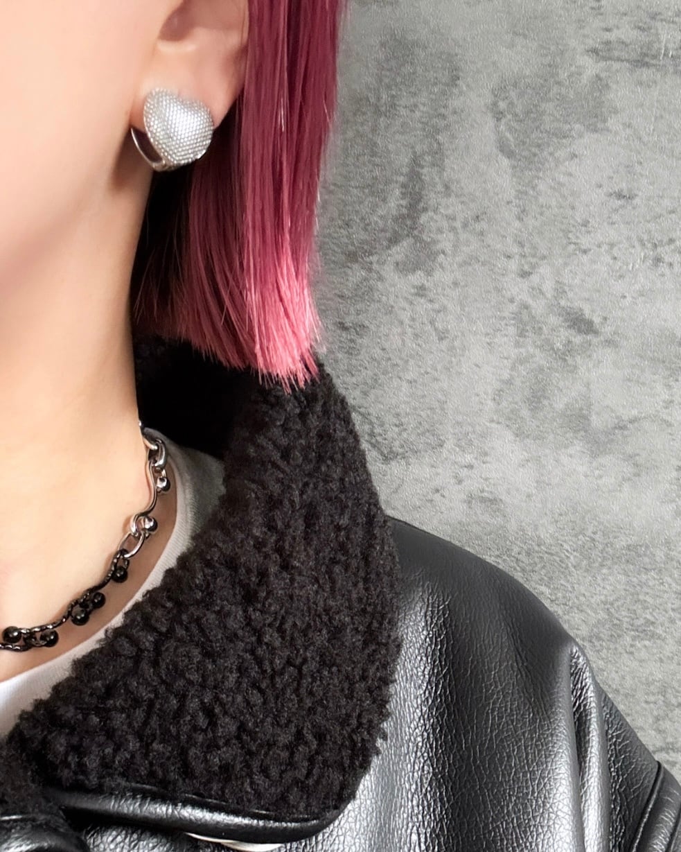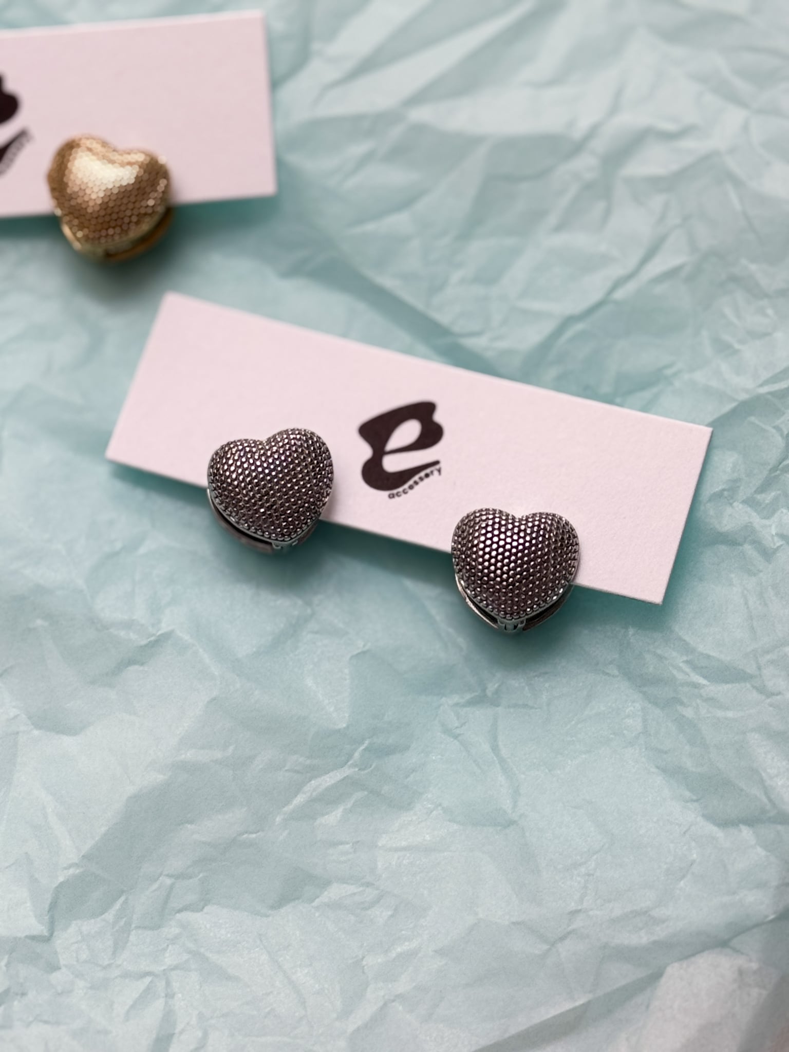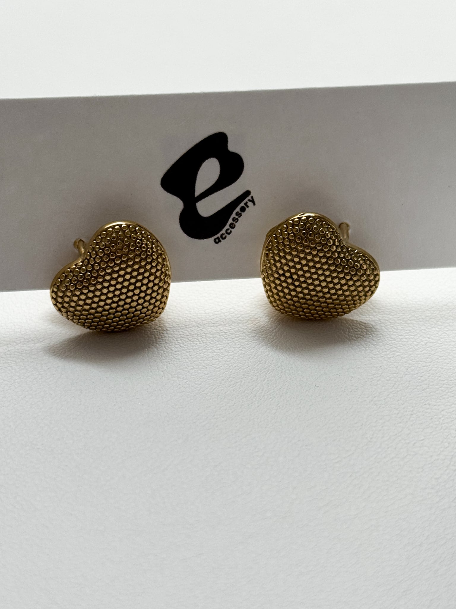 立体感のあるハートフォルムに細かいドットを施した無機質な質感のピアスになります
